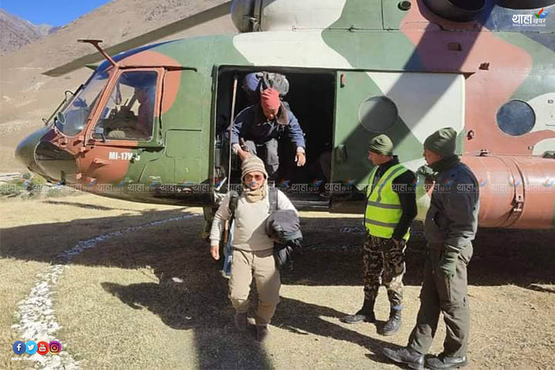 सुर्खेत : डोल्पाको उत्तरी क्षेत्रमा पर्ने उपल्लो डोल्पामा अलपत्र परेका कर्मचारी र सुरक्षाकर्मीको हेलिकप्टरबाट सदरमुकाम दुनै ल्याइएको छ।