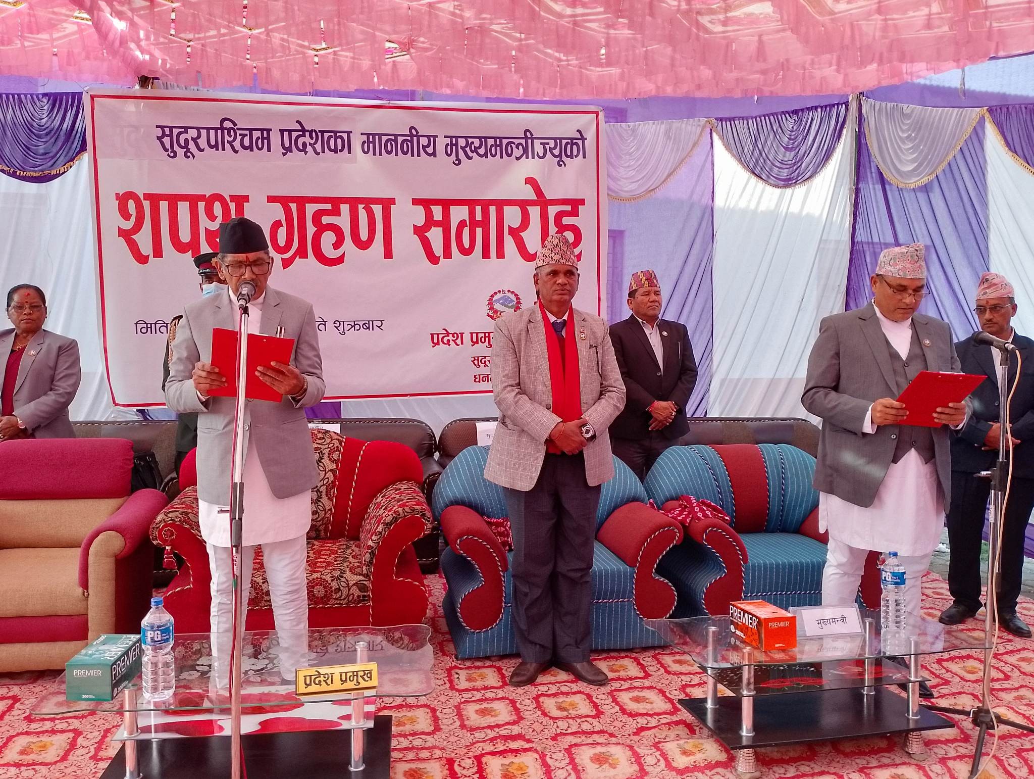 सुदूरपश्चिम प्रदेशका नवनियुक्त मुख्यमन्त्री कमलबहादुर शाहले पद तथा गोपनीयताको शपथ लिनुभएको छन् । बिहीबार मुख्यमन्त्री नियुक्त शाहलाई प्रदेश प्रमुख देवराज जोशीले पद तथा गोपनीयताको शपथ ग्रहण गराउनुभएको हो ।