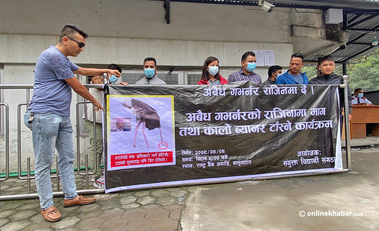 गभर्नर महाप्रसाद अधिकारीको राजीनामा माग्दै प्रदर्शन गर्दै आएका नेपाली कांग्रेस, माओवादी केन्द्र...