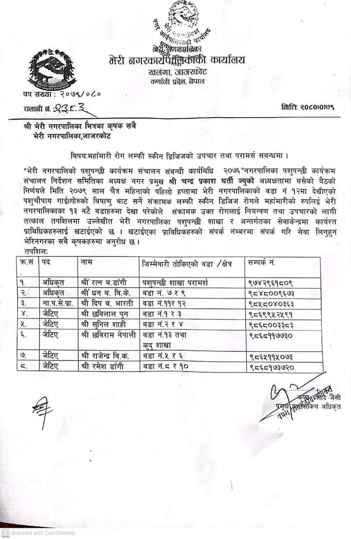 जाजरकोट । जाजरकोटको भेरी नगरपालिकाले लम्फी स्किन डिजिज रोक्न पशुपन्छी प्राविधिक खटाएको छ । महामारीको रोगको रुपमा पशु चौपायमा लाग्ने लम्फी स्किन डिजिज रोगको रोकथामका लागि नगरपालिकाले...